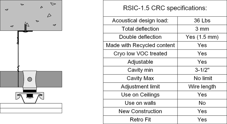 The RSIC-1.5CRC® is designed for use with any joist or concrete application where a dropped drywall ceiling is required. This assembly decouples the Gypsum Board from the floor structure above, giving the assembly enhanced acoustical performance, while allowing for a chase to hide mechanical ducting and plumbing lines. The RSIC-1.5CRC© Clip snaps onto cold rolled channel, allowing for all of the wires supporting the cold rolled channel to be hard connected to the ceiling above, including the vertical strut. The RSIC-1.5CRC© decouples the Gypsum Board below the cold rolled channel to ensure a complete decoupling of the Gypsum Board for optimum noise control.