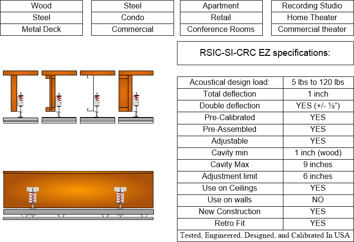 The RSIC-SI-CRC EZ is designed to isolate the ceiling consisting of 1.5" x 16 Ga cold rolled channel and furring channel (25 or 20 Ga). The RSIC-SI-CRC EZ clip is available in 10 lb, 20 lb, 40 lb, 80 lb versions. Maximum spacing for the RSIC-SI-CRC is 48" x 48" oc. The RSIC-SI-CRC EZ clips unique universal mounting system allows it to be mounted to wood and steel framed systems. The RSIC-SI-CRC EZ isolator also has an all new install EZ option for faster installation.