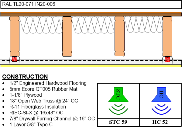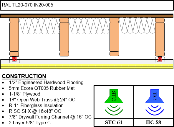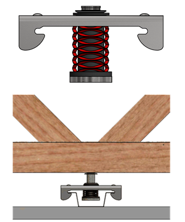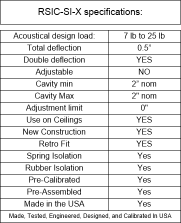 The RSIC SIX new low profile spring isolation system is designed for use with any wood framed, steel framed, or concrete ceiling system where vibration and noise control is needed. The RSIC-SIX assembly decouples and isolates the gypsum board or plywood from the structure with a low profile spring increasing the acoustical performance of the system. With an Acoustical design load range from 7 lbs to 25 lbs per isolator, the RSIC-SIX clip can support up to two layers of 5/8" gypsum board. The spacing at 16" x 48" oc is the same for 1 or 2 layers of gypsum board.