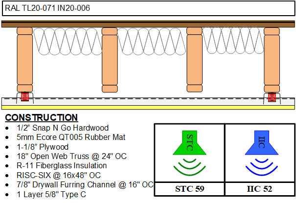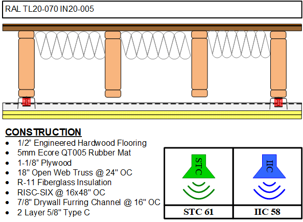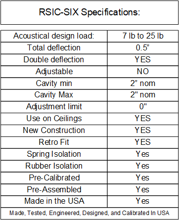 The RSIC SIX new low profile spring isolation system is designed for use with any wood framed, steel framed, or concrete ceiling system where vibration and noise control is needed. The RSIC-SIX assembly decouples and isolates the gypsum board or plywood from the structure with a low profile spring increasing the acoustical performance of the system. With an Acoustical design load range from 7 lbs to 25 lbs per isolator, the RSIC-SIX clip can support up to two layers of 5/8" gypsum board. The spacing at 16" x 48" oc is the same for 1 or 2 layers of gypsum board.
