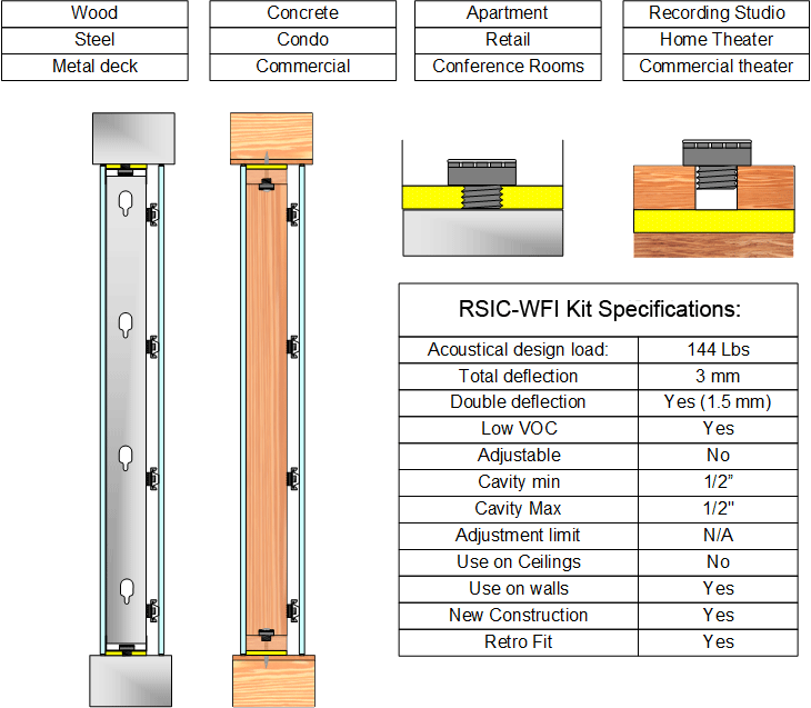 The RSIC-WFI Kit was developed to float a non load bearing wall and stop noise transfer into and out of the wall frame. This allows for a more complete isolation system for walls in theaters, recording studios, and any other wall where noise can travel up or down from the ceiling of floor above and below the wall. The RSIC-WFI Kit uses the RSIC-WFI Isolator and the RSIC-FGP fiberglass pad to create an isolation kit. Each kit covers 2 linear feet of either 3..5" or 6" wall framing. The RSIC-WFI kit can be used a the bottom and top of a wall.