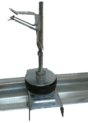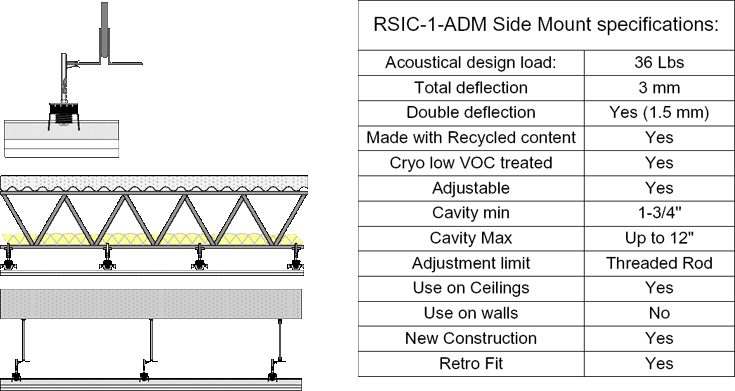 The RSIC-1-ADM® Side Mount clip designed for use with open web steel truss applications where noise control is required. The RSIC-1-ADM Side Mount isolator is a labor saving adjustable mount for steel truss. Hammer on the clip and spin the isolator to adjust up and down for a level ceiling. Secure the side mount with two strands of 18 Ga wire. With an Acoustical design load rating of 36 lbs per isolator, the RSIC-1-ADM Side Mount clip can support up to two layers of 5/8" gypsum board when spaced at 24" x 48" oc., and 3 layers when spaced at 16" x 48" oc. The RSIC-1-ADM Side Mount clip attaches directly to the side of the steel truss decoupling the gypsum board from the structure stopping STC and IIC vibrations from entering the space below.