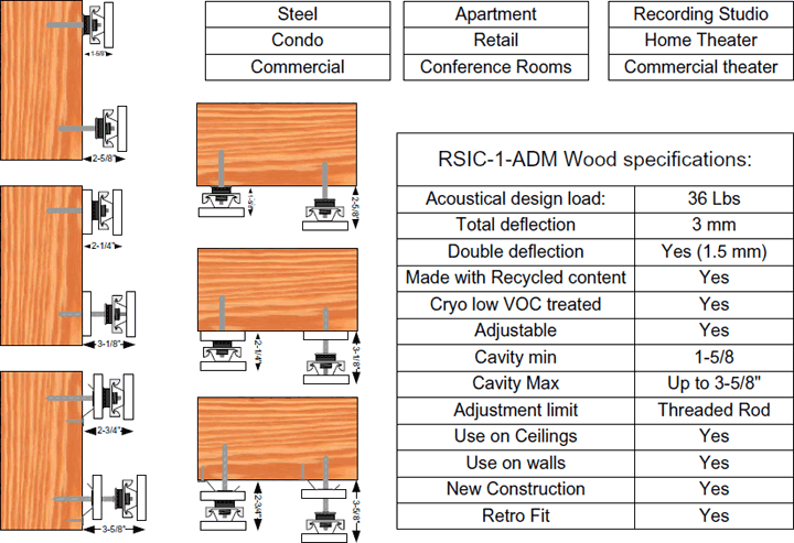 The RSIC-1-ADM Wood clip designed for use with Wood ceilings where noise control is required. The RSIC-1-ADM Wood isolator is a labor saving adjustable mount walls and ceilings. The RSIC-1-ADM Wood isolator can be installed directly to the stud or joist, over direct mounted gypsum board, or over and RC-1 system. With an Acoustical design load rating of 36 lbs per isolator, the RSIC-1-ADM Wood clip can support up to two layers of 5/8" gypsum board when spaced at 24" x 48" oc., and 3 layers when spaced at 16" x 48" oc. The RSIC-1-ADM Wood clip attaches to the bottom of the framing or wall studs decoupling the gypsum board from the structure stopping STC and IIC vibrations from entering the space below.