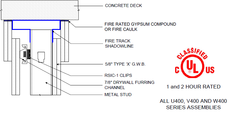 RSIC-1 Head of Wall Fire Track Shadowline detail. The RSIC-1 is approved for use in UL Fire resistive Design UL HW-D-0060 and UL HW-D-1011 one and two hour fire rated head of wall designs. These head of wall designs can be used in all U400, V400 and W400 series steel frame wall designs where the RSIC-1 clip is published in the Fire Resistive Design.