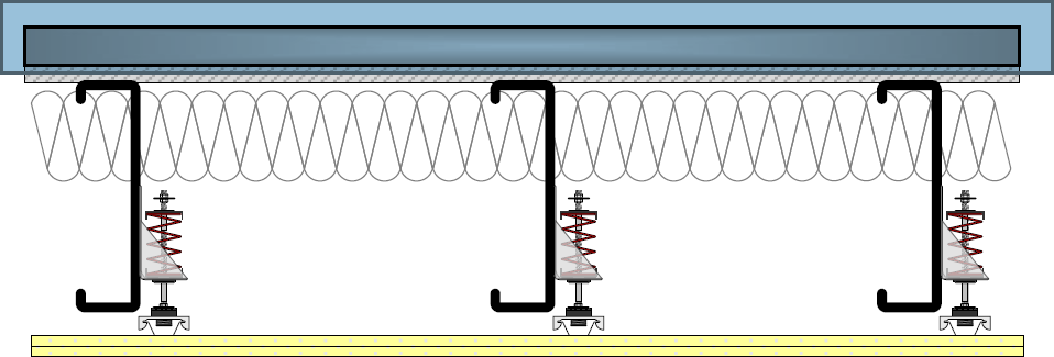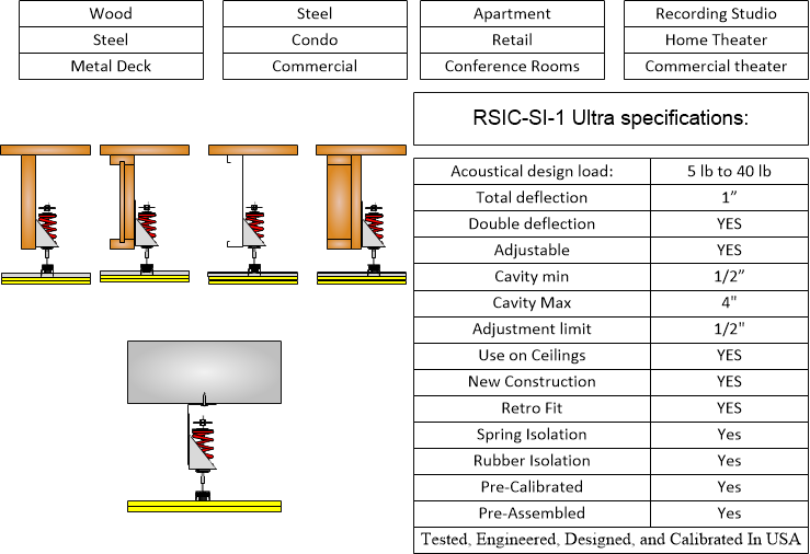 The RSIC SI-1 Ultra is designed for use with any wood framed, steel framed, or concrete (with Over Head Adapter) ceiling system where noise control is needed. The RSIC-1 assembly decouples and isolates the gypsum board or plywood from the structure increasing the acoustical performance of the system. With an Acoustical design load range from 5 lbs to 40 lbs per isolator, the RSIC-SI-1 Ultra clip can support up to two layers of 5/8" gypsum board when spaced at 24" x 48" oc. For heavier systems increase the number of isolators to support the additional weight of the system. The RSIC-SI-1 Ultra clip fastens directly to the framing or structure creating an air cavity between the face of the framing and the back of the gypsum board. The RSIC-SI-1 Ultra stops the noise and vibrations that typically would be allowed to transfer through the structure.